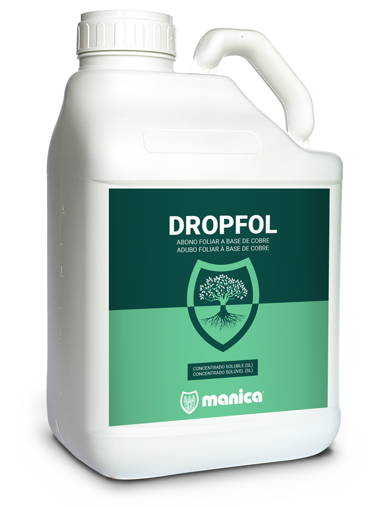 DROPFOL es un fertilizante en base a cobre al 5.5% complejado con ácido cítrico en forma de concentrado soluble (SL).